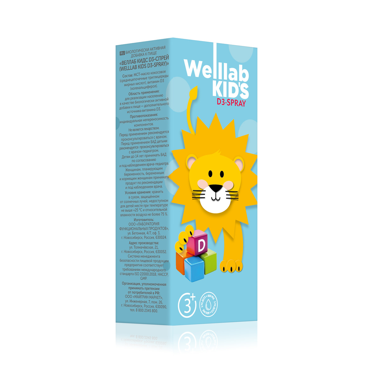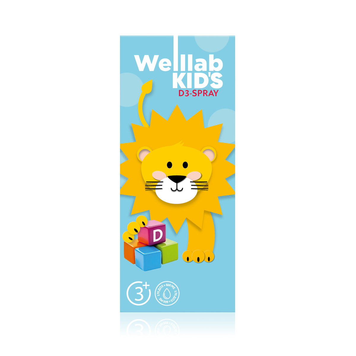WELLLAB KIDS D3-СПРЕЙ — «солнечный» витамин для детей с 3 лет в виде удобного спрея. Продукт легко дозируется: при одном нажатии в организм поступает 600 МЕ витамина D3, при трех нажатиях — 1800 МЕ. Обновленная формула не содержит ароматизаторов. Без сахара, красителей и консервантов.
